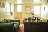 At the entry, one of two plywood steps leading down into the unit is extended, forming a bench with storage for the dining table. New cork flooring replaces the dated half-carpet, half-linoleum combo, acting as both an acoustic barrier and a layer of visual warmth. A breakfast bar in the kitchenette was removed to open up the living space, and the shower was relocated to the opposite side of the hallway to create a clearer path through the unit.